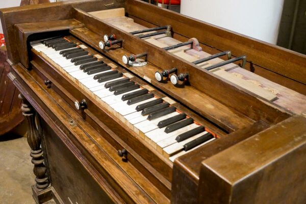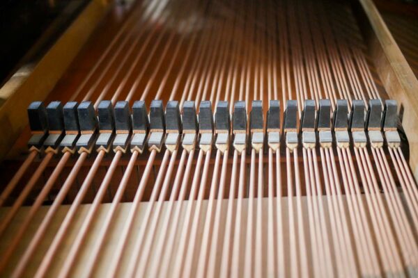 La suite de la restauration concerne toujours la partie mécanique du piano. Après le remplacement des pièces défectueuses (vis, bouton d’échappement, etc.), j’effectue un dressage minutieux du clavier. Il s’agit de niveler chaque touche à la même altitude et avec le même enfoncement de 9mm dans le cas de ce piano.