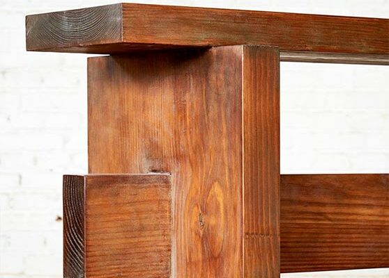 Conception technique, prototypage et réalisation d’un mobilier de présentation en yellow pine massif, teinté, vernis et ciré.