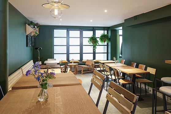 Aménagement, décoration d’intérieur, suivi de chantier immobilier, conception et réalisation du mobilier pour un bar à frite à Bruxelles.