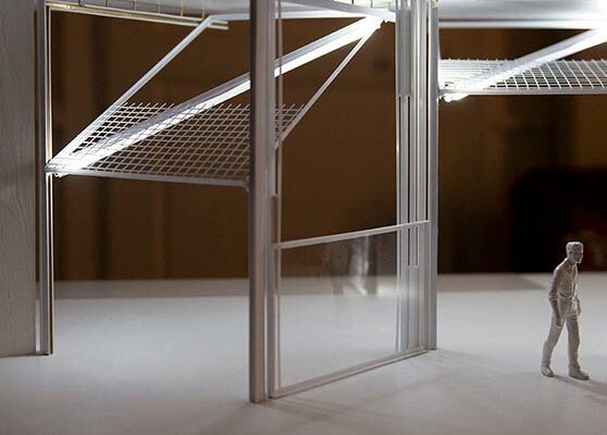 Trois hyperboloïdes de révolution (x2/a2 + y2/b2 – z2/c2 = 1) est une installation dont les composantes sont la géométrie, la lumière et le mouvement.