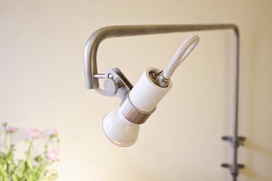 Un grand disque en sapin brut fixé au plafond, 2 fonctions : rétroéclairage pour une lumière tamisée ou support de spot à pince pour une lumière ponctuelle.