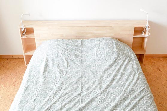 Grand lit de 160 cm, Morgenhår est un meuble en hévéa massif vernis. La tête de lit et les chevets sont intégrés.